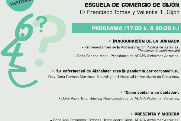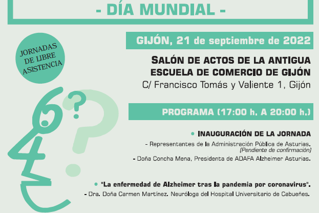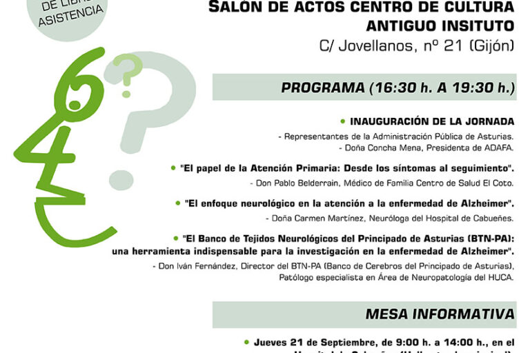 21ª Jornada Sobre el Mal de Alzheimer Un año más ADAFA Asturias ha organizado una serie de actos en Oviedo y Gijón, para conmemorar el Día Mundial del Alzheimer. Os mostramos los carteles con toda la información.