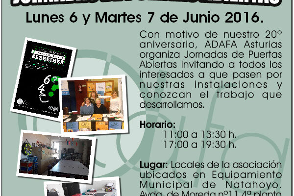 20ª Jornada de Primavera sobre el Alzheimer ADAFA Asturias celebra su 20ª Jornada de Primavera sobre la Enfermedad de Alzheimer coincidiendo con su 20 aniversario. Como cada año con bastante antelación se envía la información a todos los socios, centros de servicios sociales, centros de salud, hospitales, residencia y Centros de Día Públicos y Privados…Os…