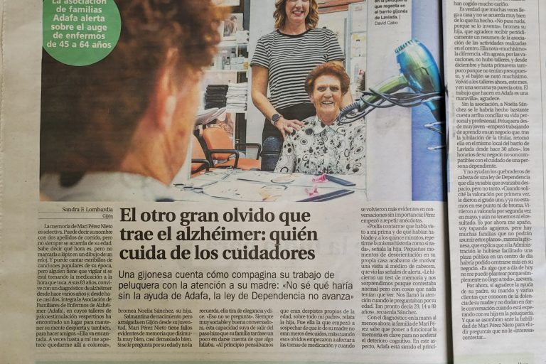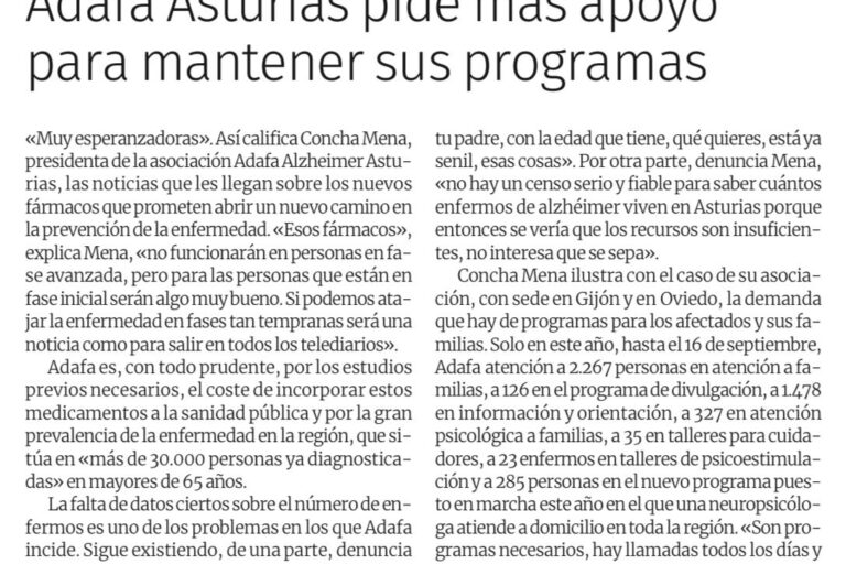 Nos hacemos eco, de dos entrevistas publicadas hoy en La Nueva España en la edición en papel. Una de ellas, es la entrevista de una socia de ADAFA, en la que relata su vivencia con la enfermedad de su madre. La otra es la entrevista a la Presidenta de ADAFA Alzheimer Asturias. Os…