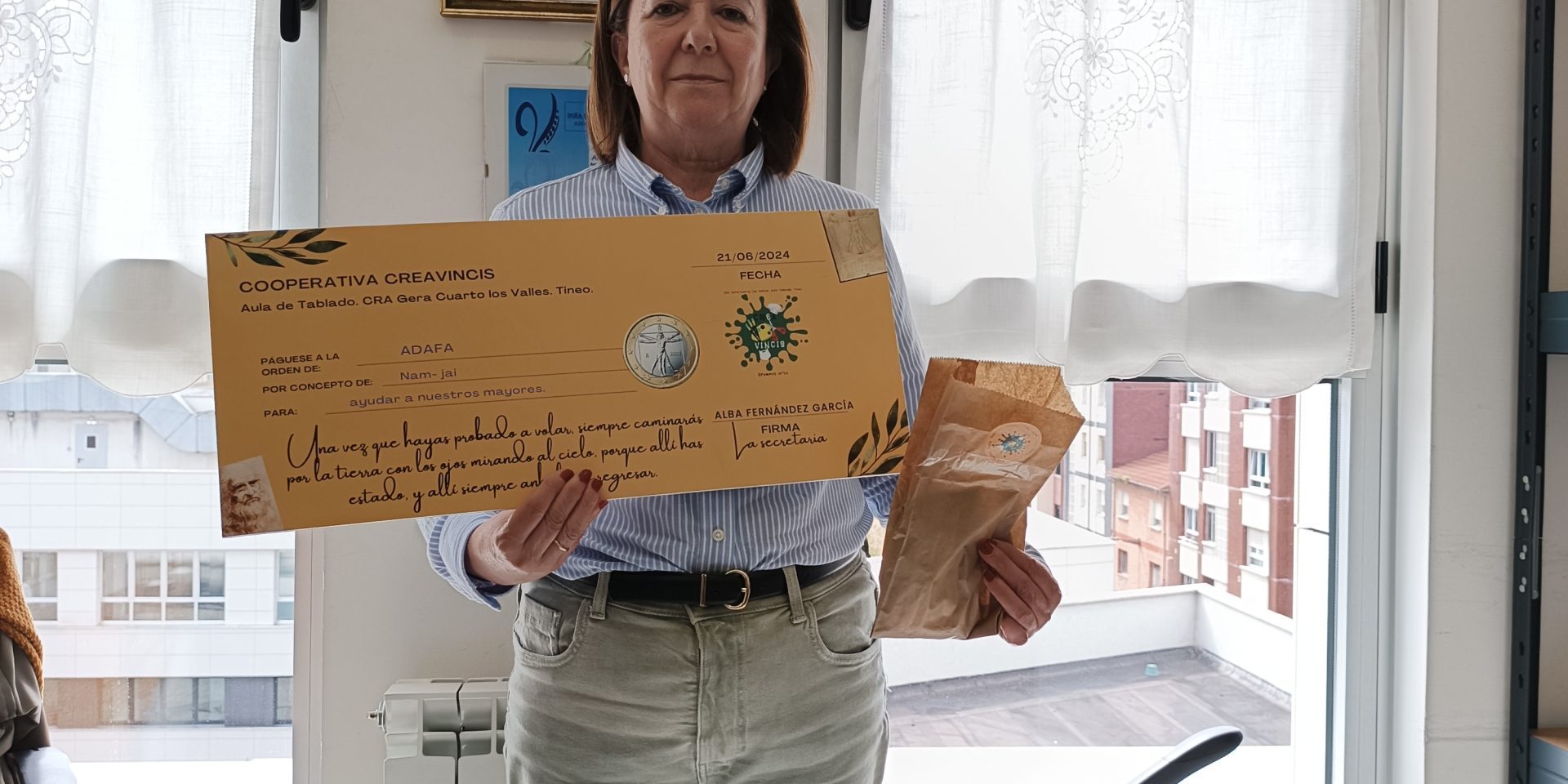 Los alumnos de Aula de Tablado (Tineo) nos han hecho entrega del donativo equivalente al 30% de los beneficios obtenidos durante el curso 2023 – 2024. Dichos beneficios fueron generados por la venta de productos artesanales realizados por los niños y las niñas de la escuela de Tablado (Tineo)a través de su cooperativa Creavincis S.L. Dicha donación, será destinado a uno de nuestros programas, en concreto, a la adquisición de material tecnológico para el Taller de Psicoestimulación Vida y respiro, dirigido a enfermos de Alzheimer en fase leve moderada.