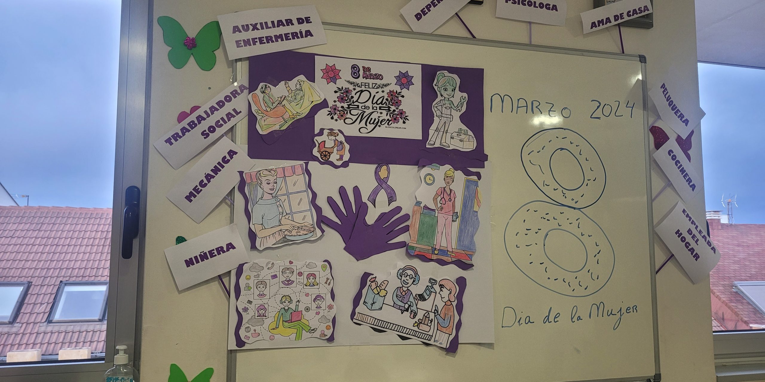 Por motivo del Día Internacional de la Mujer, los/as usuario/as del taller de psicoestimulación, han estado trabajando en una actividad dedicada a este día donde se reivindican la igualdad y los derechos que tenemos, a día de hoy, las mujeres que han luchado tanto a lo largo de los años. Os mostramos un mural donde figuran unos pequeños recortes, haciendo referencia a las diferentes profesiones que ejercen y/o han ejercido las usuarias del taller de psicoestimulación. Intentamos, a través de estas actividades, seguir manteniéndoles, en la medida de lo posible, con situaciones reales. Del total de usuarios y usuarias, solo mostramos fotos de aquellos que han dado consentimiento para ello.