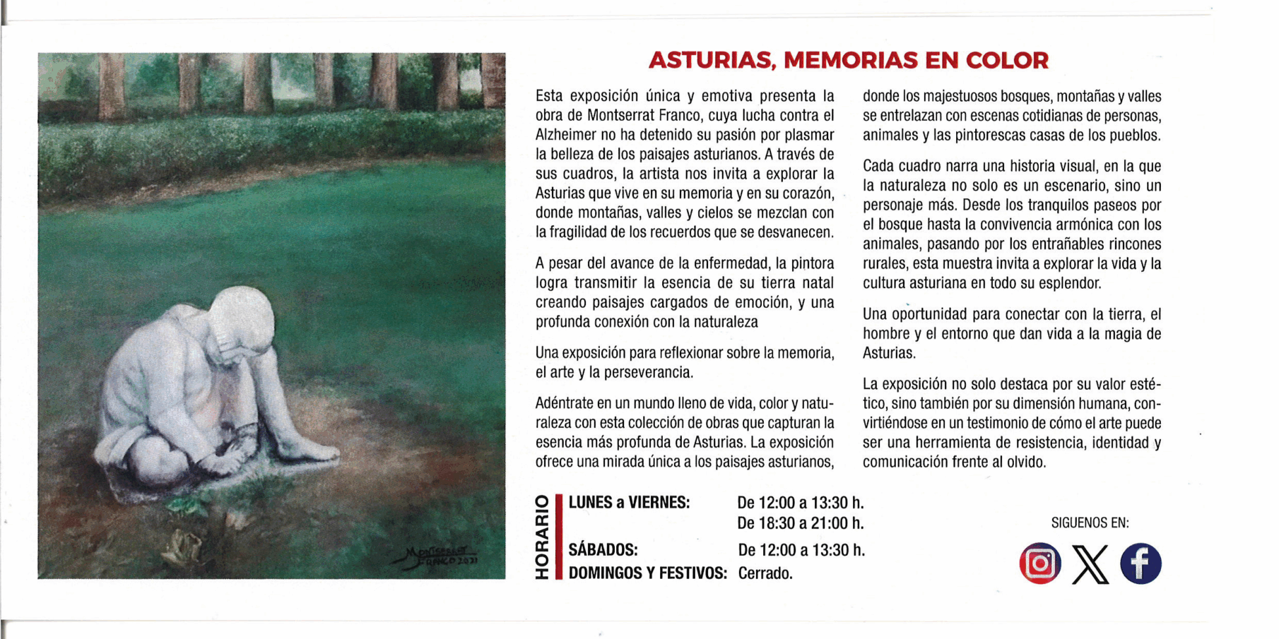 ADAFA Alzheimer Asturias, ha acudido a la inauguración de la Exposición de pintura “Asturias, Memorias en Color” que tuvo lugar el pasado viernes 13 de junio en la Sala de Arte de Fundación Alvargonzález en Gijón. En la exposición se encuentran cuadros pintados por una usuaria de nuestro Taller de Psicoestimulación que ha sido pintora de profesión. Los cuadros se han realizado teniendo el diagnóstico de deterioro cognitivo.